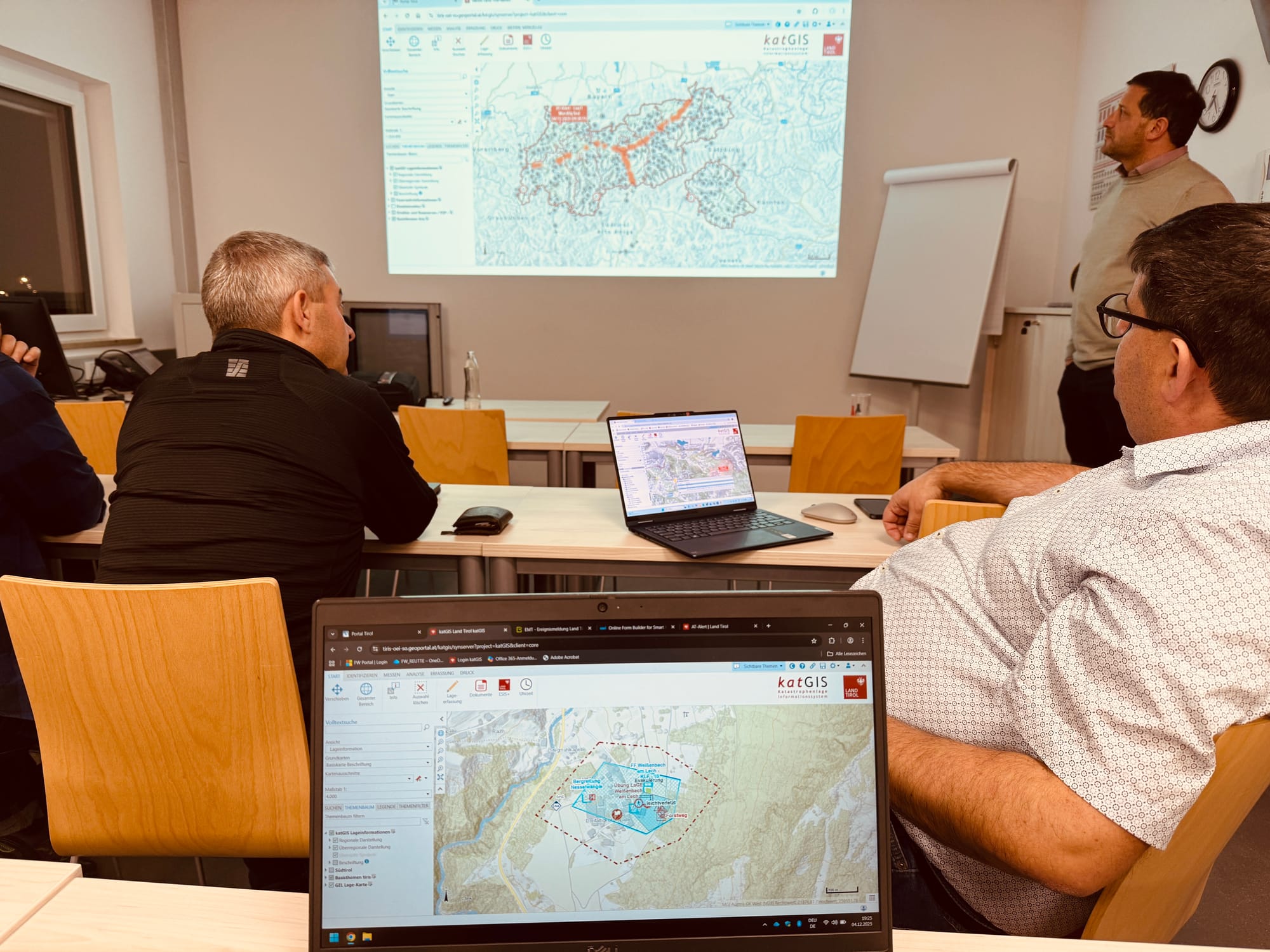 Thomas präsentierte die neue Version des digitalen Lageerfassungs- und Lageinformationstools katGIS. Dieses Katastrophenlage-Informationssystem dient der Visualisierung von Ereignisräumen bei Schadensereignissen und ist über verschiedene Schnittstellen mit dem tiris-Kartendatenpool sowie der Leitstelle Tirol verbunden.