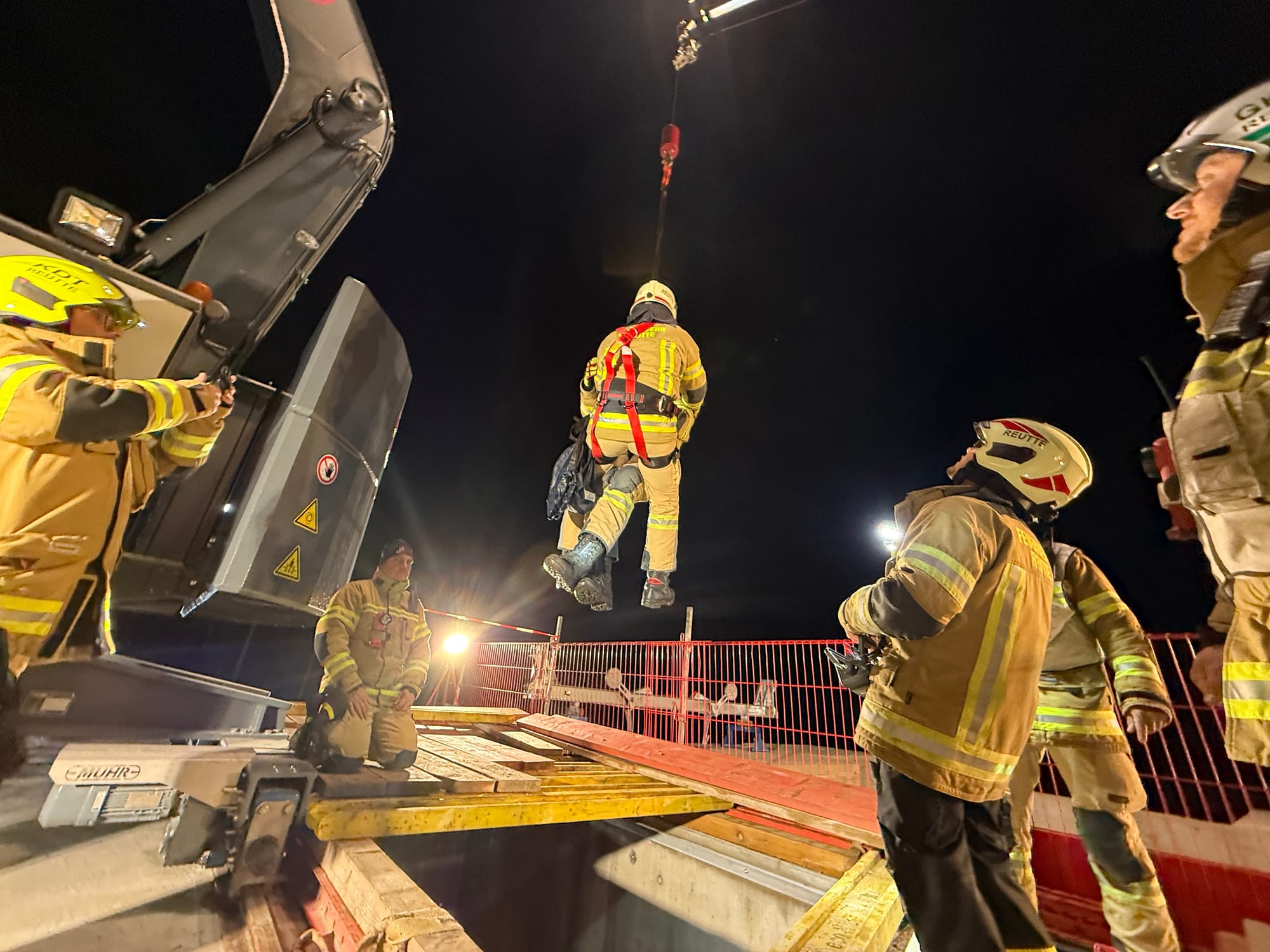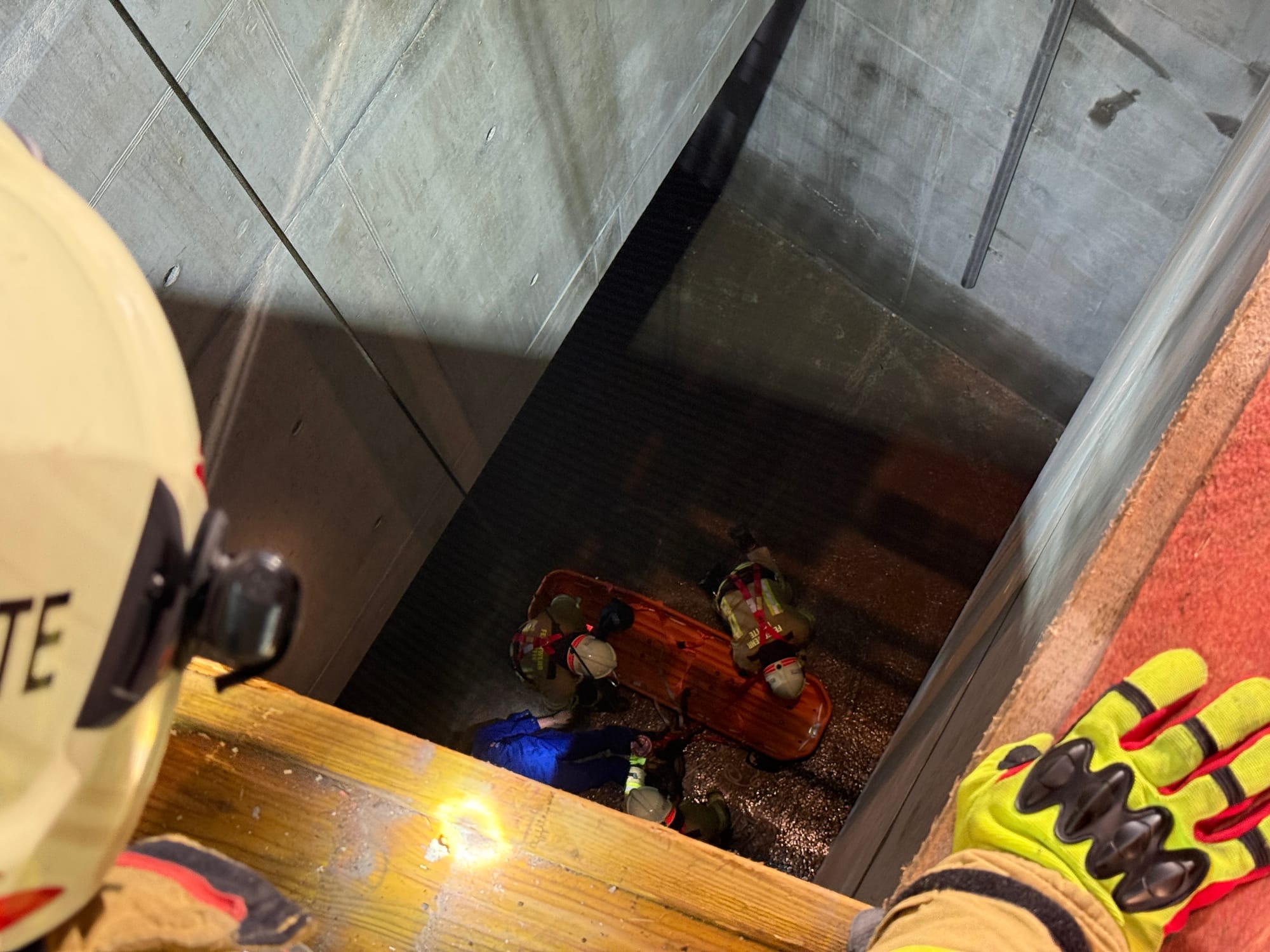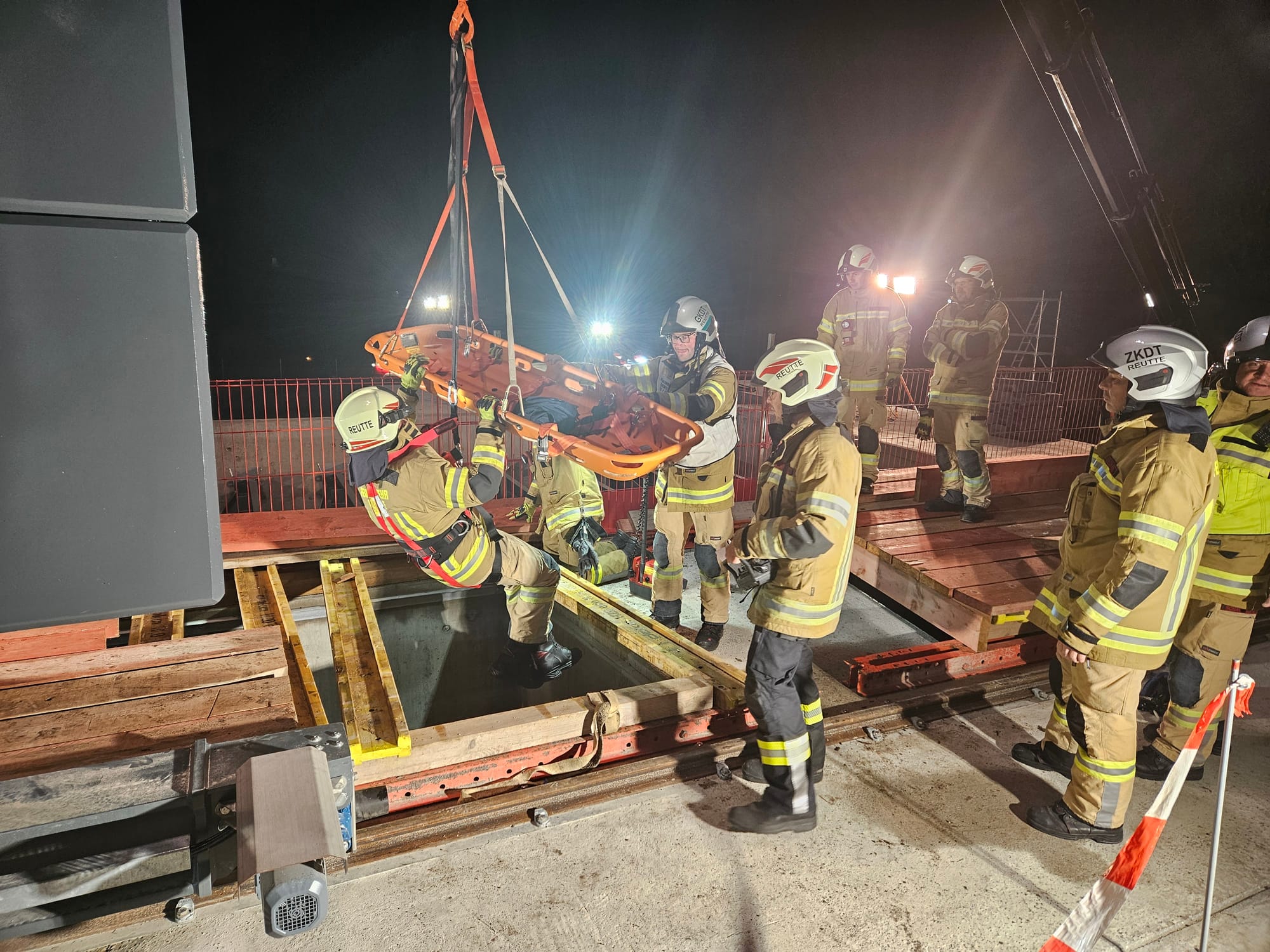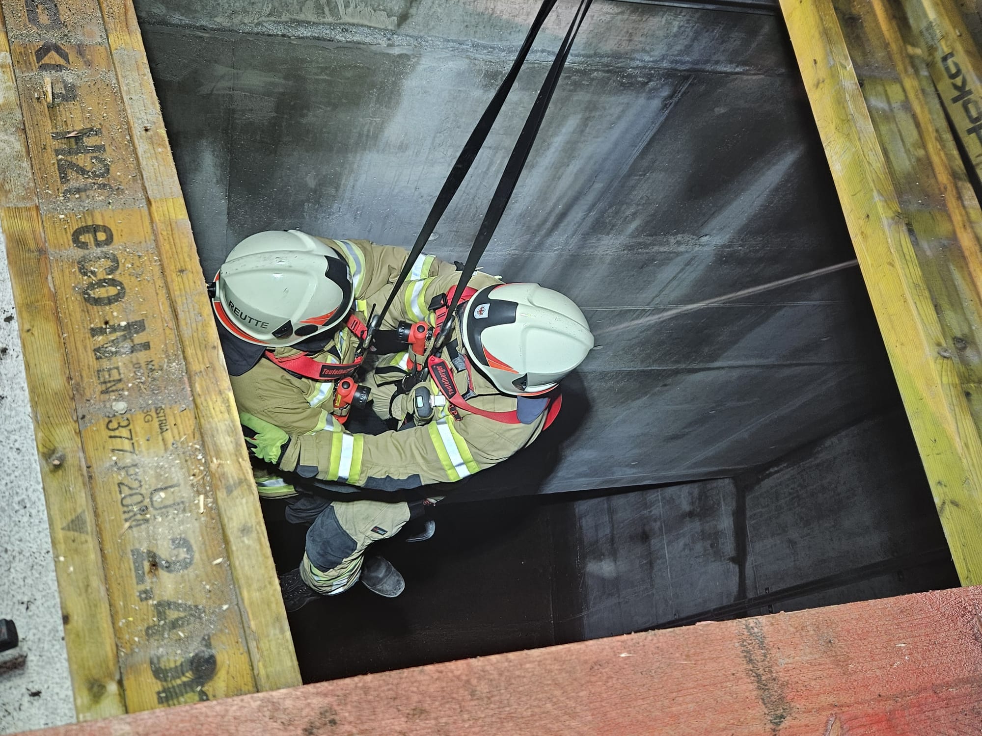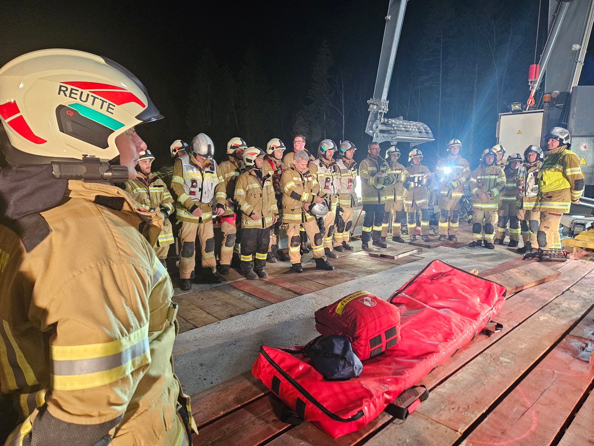 Das Übungsszenario fand auf der Kraftwerksbaustelle des Elektrizitätswerks Reutte (EWR) statt: Ein Arbeiter war in einen rund zehn Meter tiefen Schacht gestürzt und hatte sich dabei verletzt. Da die Zugänge zur Patientenversorgung und anschließenden Bergung ausschließlich senkrecht möglich waren, stieg der Schwierigkeitsgrad erheblich. Für die Erstversorgung mussten Feuerwehrkräfte mit Fünfpunktgurten ausgerüstet werden und mithilfe der Personenwinde des SRF-Krans in den Schacht abgelassen werden. Zusätzlich wurde geeignetes Material für die Bergung per Kran nach unten gebracht. Die Herausforderungen lagen jedoch nicht nur in der technischen Umsetzung, sondern auch in den erschwerten Umgebungsbedingungen: