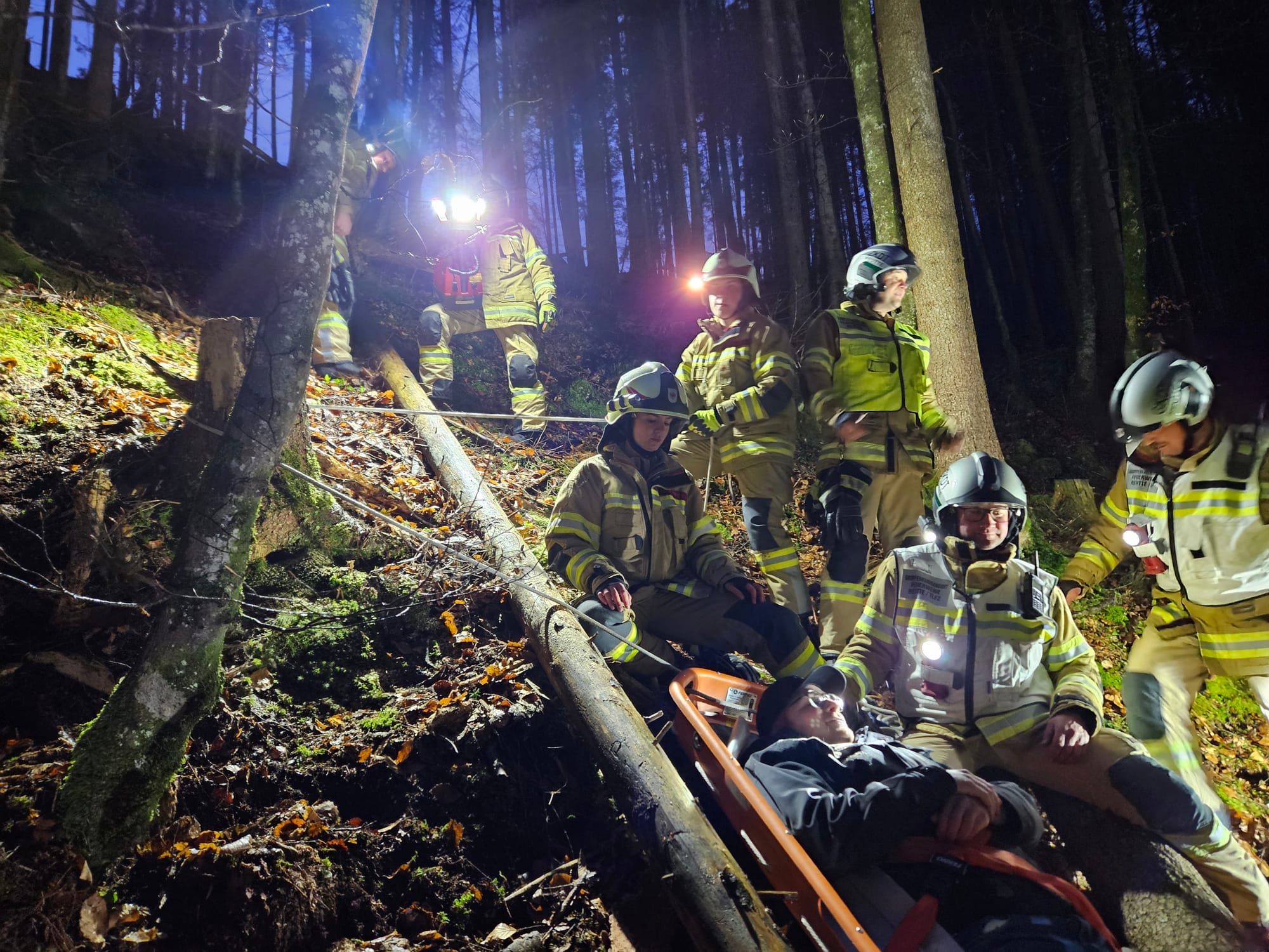 Am Dienstag, dem 14. April 2026, fand im steilen Gelände des Klausenwaldes eine anspruchsvolle technische Übung statt. Angenommen wurde ein schwerer Forstunfall: Zwei Holzarbeiter verunglückten bei Fällarbeiten.