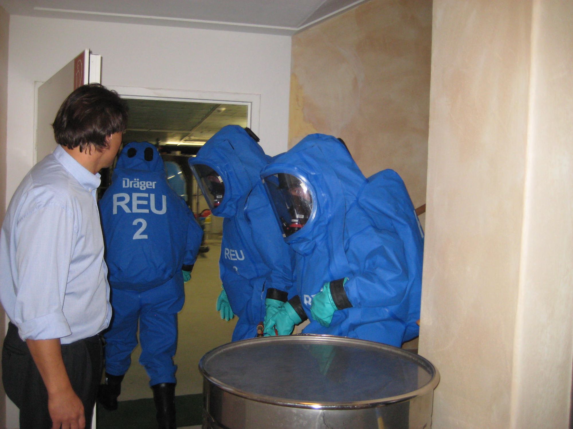 Am Einsatzort wurde zunächst die Lage erkundet und mit Hilfe unserer Gefahrgutdatenbanken festgestellt, welche Gefahren vom ausgelaufenen Stoff ausgehen. Daraufhin wurde der Entschluss gefasst, dass ein Atemschutztrupp unter Verwendung von Körperschutzanzügen der Schutzstufe 3 in den Technikraum vorgeht um das ausgelaufene Gefahrgut mit einem Wassersauger und Bindemittel zu binden. Nach dem sich der Trupp ausgerüstet hatte wurde unverzüglich mit dem Binden des Stoffes begonnen. Ein zweiter Atemschutztrupp der Feuerwehr Reutte rüstete sich mit Schutzanzügen der Schutzstufe 2 aus und stand als Rettungstrupp für Notfälle bereit. Als die Verschmutzung so weit beseitigt war konnte der Atemschutztrupp mit den Schutzanzügen der Stufe 3 seinen Einsatz beenden und wurde durch die Feuerwehr Breitenwang dekontaminiert. Es wurde nun begonnen den Raum mit dem Be- und Entlüftungsgerät zu belüften um die Chlorgaskonzentration zu senken. Der zweite Atemschutztrupp führte dabei unter Schutzstufe 2 ständig Messungen der Gaskonzentration durch. Als die Chlorgaskonzentration im Raum den MAK Wert (Maximale Arbeitsplatz Konzentration) unterschritten hatte wurde durch Ing. Andreas HOSP von der BH Reutte die Anlage besichtigt und die weitere Vorgehensweise festgelegt. Um etwa 21.30 Uhr war für die Feuerwehr Reutte der Einsatz vor Ort so weit beendet und die Fahrzeuge konnten wieder nach Reutte abrücken, wo noch das ganze eingesetzte Gerät gereinigt und gewartet werden musste. Um 23.00 Uhr war alles gereinigt und aufgerüstet und die Einsatzbereitschaft wieder hergestellt.